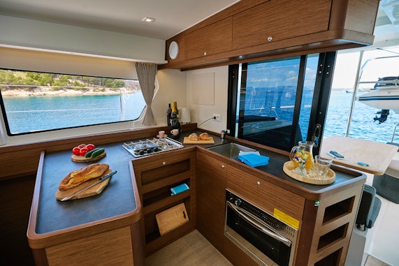 The salon onboard this Lagoon 42 catamaran is modern in design, with a central entertaining/dining area that is perfect for meals onboard or relaxing in the air-conditioning. The fully equipped kitchen features a fridge/freezer, stovetop, sink, Nespresso coffee machine (with 20 capsule starter pack) and all the utensils you'll need to entertain onboard.