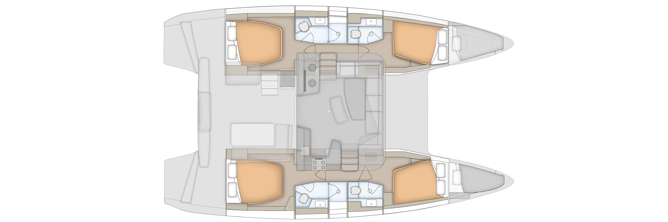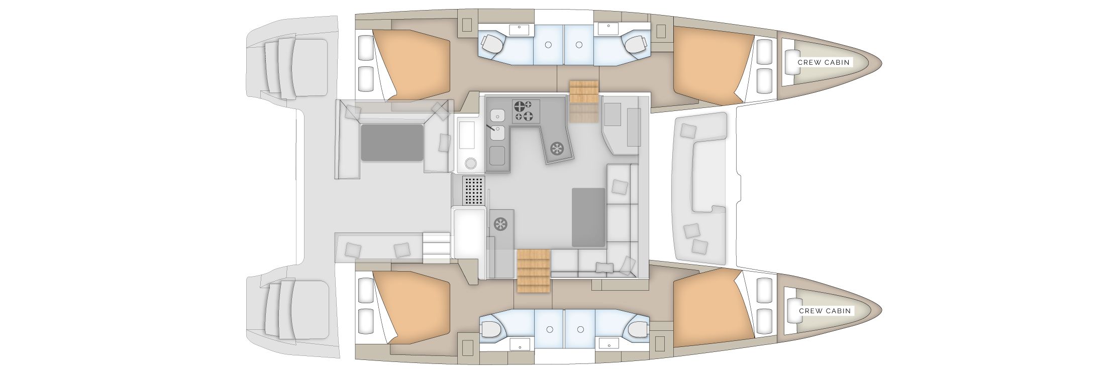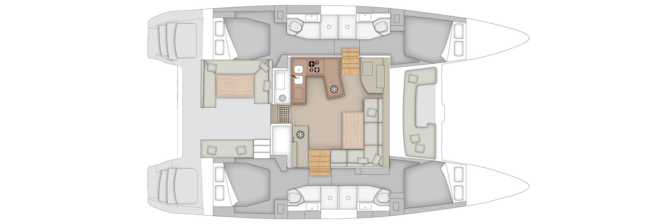 The catamaran sleeps 8 people in 4 ensuite cabins and can accommodate an additional 2 in the salon, which converts into a double. Each cabin features a cabin fan and USB charging ports.