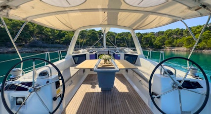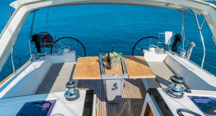The spacious cockpit area onboard this Beneteau Oceanis 46.1 sailing yacht is ideal for alfresco dining and provides the perfect space to relax while sailing. Choose to escape the heat of the day with the protective bimini or lap up the sunshine when the bimini is down. The foldable central table and comfortable cushions ensure dining in the cockpit is an enjoyable experience.