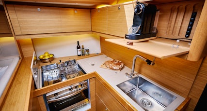 This spacious and stylish salon has been designed with relaxation in mind and is complete with a U-shaped lounge that surrounds the central dining table. The salon is complete with a fully self-contained kitchen including a refrigerator, freezer, stove top, sink, Nespresso coffee machine (with 20 capsule starter pack) and all the utensils you'll need to entertain onboard.