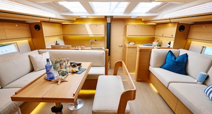 The air-conditioned salon of this Beneteau Oceanis 46.1 sailing yacht is soaked in natural sunlight, thanks to large hull portholes located overhead. Salon fans also assist with circulating air throughout this communal area.
