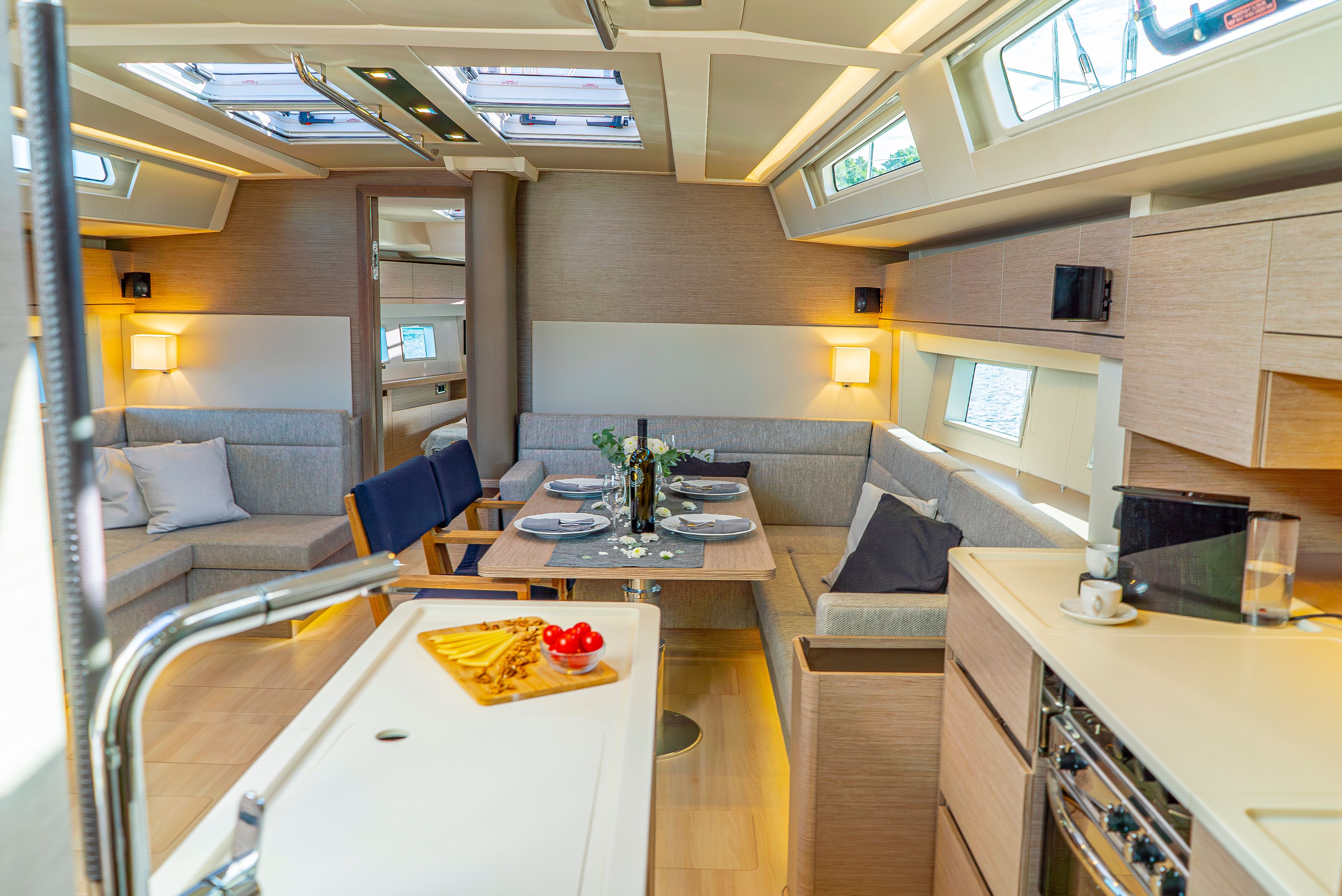 Imitation teak decking gives a luxurious feel to the exterior of this Hanse 548 luxury sailing yacht. Since the deck is free of lines and fittings, it allows for uncompromised comfort and space onboard for sunbathing.