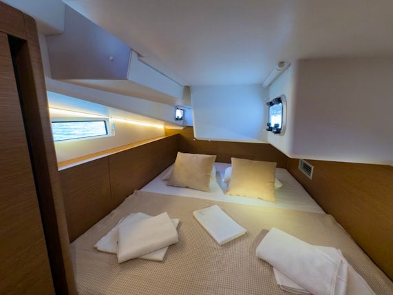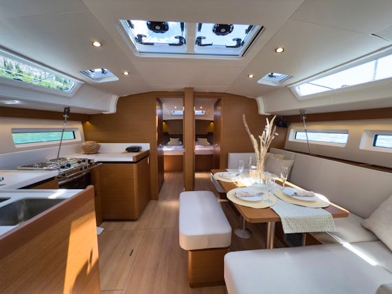 The Jeanneau Sun Odyssey 490 sailing yacht comfortably accommodates 8 guests in 4 ensuite cabins, with the salon able to convert into a double to accommodate the Skipper if all cabins are occupied.