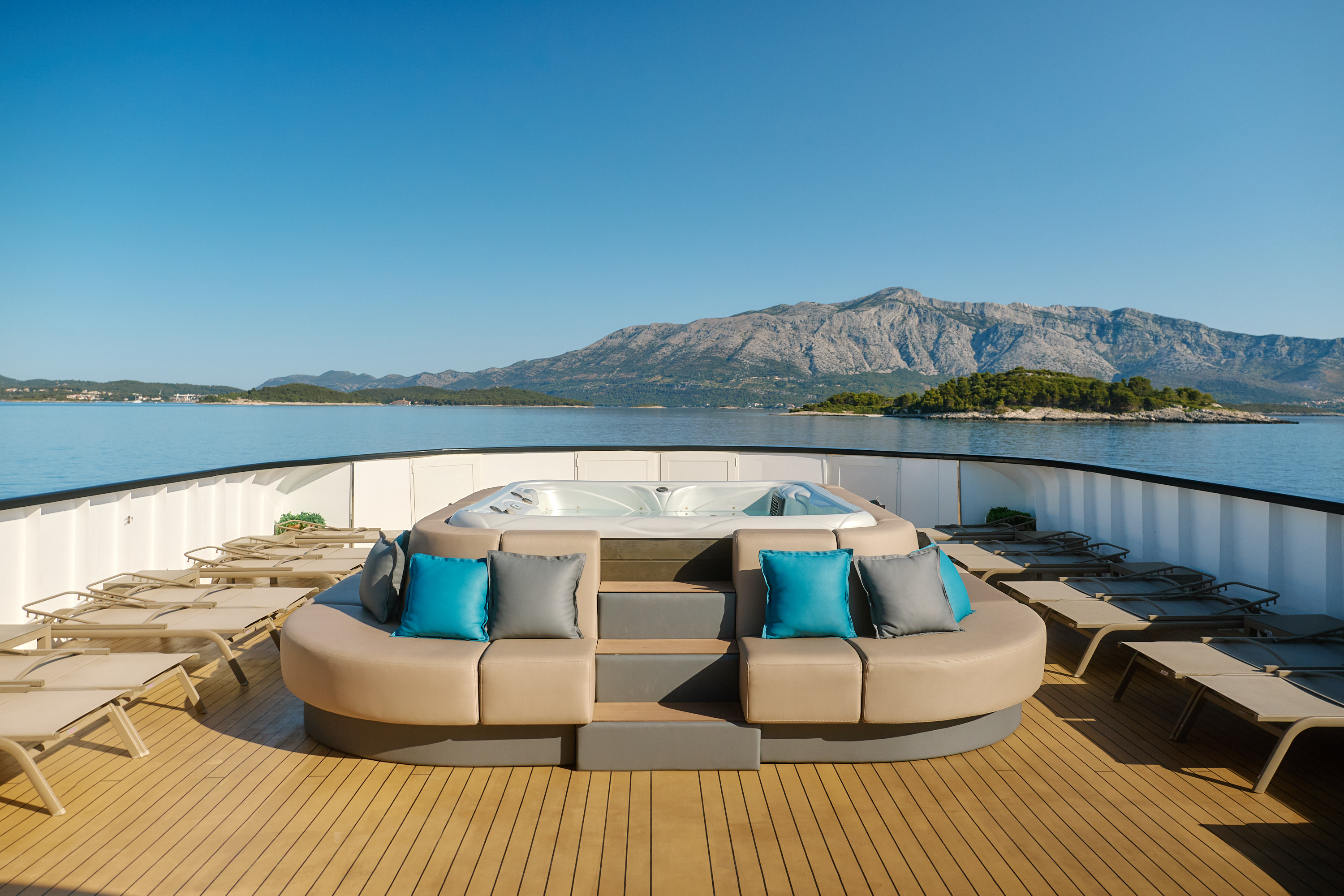 The Main Deck features an alfresco lounge area, where guests can relax on the super lounger and relax in the shade with a coffee. A swimming platform is accessible via stairs at the rear of the ship, making it easy for guests to access the water during swim stops.