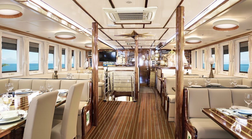The Main Deck onboard this ship features a jacuzzi and sun loungers located at the bow. The rear of the vessel offers a shaded lounge area which is the perfect place to sip on a coffee and watch the impressive views pass by.