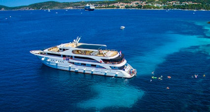 This impressive ship features a spacious top deck complete with a jacuzzi, multiple lounge areas to relax and unwind, and sunloungers to soak up the sunshine as you sail to your next destination.