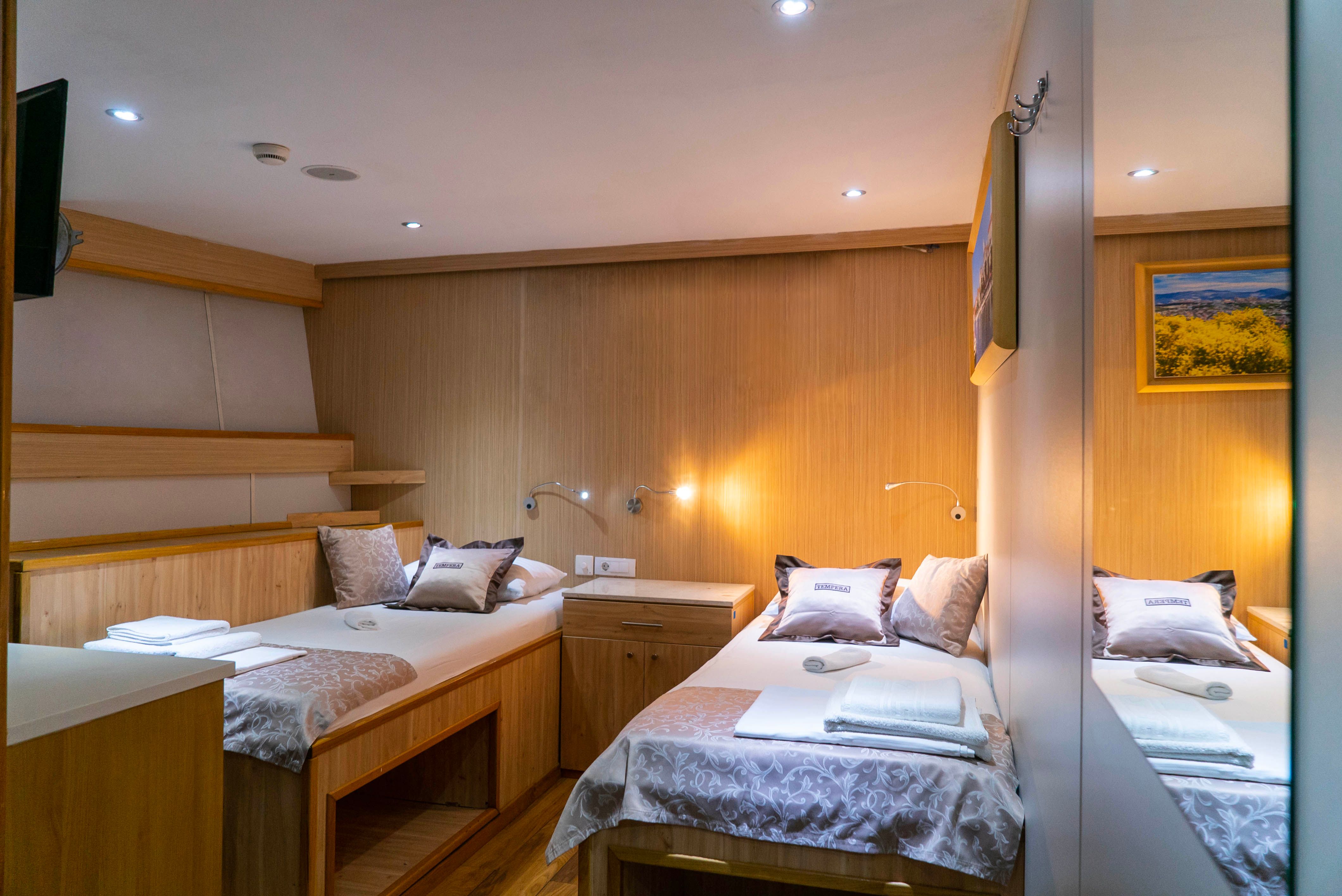 Tempera accommodates 36 guests (plus crew) in Above and Lower Deck ensuite cabins. These modern cabins have an average cabin size of 12m2, are fitted with either double or twin beds and all feature air-conditioning.